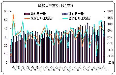 下圖為2009年至2012年全國粗鋼日均產(chǎn)量及環(huán)比增幅。從圖上看,繼去年11月份全國粗鋼產(chǎn)量正增長以外,截至到目前已經(jīng)連續(xù)五個月呈現(xiàn)環(huán)比上升態(tài)勢,并且四月份日均粗鋼產(chǎn)量已經(jīng)達(dá)到201.9萬噸的峰值,遠(yuǎn)遠(yuǎn)超過了往年。從線材、螺紋鋼產(chǎn)量來看,4月份也繼續(xù)增長。其中線材、鋼筋產(chǎn)量分別為1143.2萬噸和1461.6萬噸,日產(chǎn)量分別為38.1萬噸和48.72萬噸,環(huán)比上月增幅分別為0.38%和0.89%。雖然本月增幅有所減少,但在基數(shù)較大并且連續(xù)三個月正增長的前提下,當(dāng)前線螺產(chǎn)量已經(jīng)遠(yuǎn)遠(yuǎn)超過了國內(nèi)需求(國內(nèi)線材、螺紋鋼出口均很有限)。