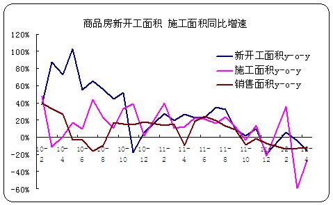 下圖為我國商品房新開工面積、施工面積以及銷售面積同比增速走勢圖,從圖上可以看出,4月份我國商品房同比增速均繼續(xù)呈現(xiàn)負(fù)值。繼國內(nèi)一線城市以及省會城市實(shí)施限購政策以來,商品房投資可謂一路下滑。不僅對國內(nèi)消費(fèi)影響較大,同時也導(dǎo)致開發(fā)商對終端鋼材的需求量出現(xiàn)了明顯的回落。尤其是2012年前四個月,銷售面積同比增速一直下滑,并且新開工面積和施工面積也徘徊在零增速附近。