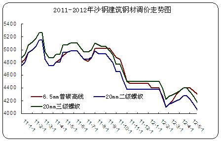以下是河鋼和沙鋼兩大鋼廠2011年-2012年建筑鋼材政策調(diào)整走勢圖。由于本月國內(nèi)主要市場建筑鋼材現(xiàn)貨價格下滑幅度較大,一線鋼廠雖略有滯后,但整體上均以降價為主,并且降幅要小于現(xiàn)貨市場,也就是說,在鋼廠價格調(diào)整之后,主導(dǎo)市場價格仍然倒掛,貿(mào)易商也仍處于虧損狀態(tài)。尤其是河北鋼鐵集團(tuán),在北方市場整體出貨情況不樂觀的情況下,鋼廠甚至出臺相關(guān)政策,限制代理商降價幅度,以保證其訂貨價格。但是這樣一來,河鋼與其他鋼廠資源價差逐步增大,不但對于其自身出貨不利,反而增大了貿(mào)易商的虧損幅度以及市場資源量的消化,因此在這種情況下,中間商也只能以暗降為主。另外由于國內(nèi)整體資源去庫存進(jìn)度較慢,以及后期市場風(fēng)險猶存,多數(shù)大廠代理商訂貨情況均不好。