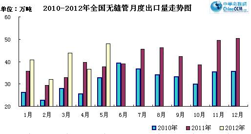 2012年6月份出口無縫管48.27萬噸,比去年同期多出口9.36萬噸,同比增長24.06%。6月份出口量環比5月份增加0.25萬噸,環比增長0.52%。2012年上半年累計出口無縫管249.6萬噸,同比增長16.41%。預計全年無縫管出口量可望突破500萬噸。
