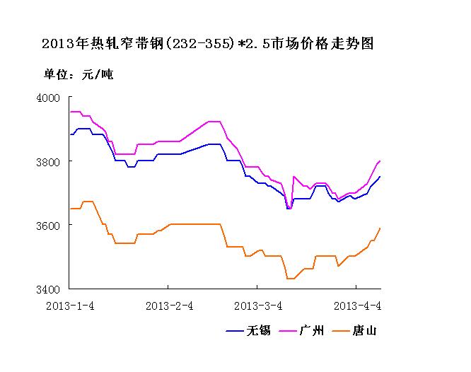 清明小長(zhǎng)假過后,國(guó)內(nèi)帶鋼市場(chǎng)迎來一波小漲行情。北方主導(dǎo)市場(chǎng)帶鋼走勢(shì)因利好消息的刺激,期貨震蕩走高信心的提振,以及鋼坯成本持續(xù)抬升的推助,北方帶鋼首先領(lǐng)漲。南方市場(chǎng)商家節(jié)后歸來,因北方拿貨成本持續(xù)增加,同時(shí)進(jìn)行了補(bǔ)漲。春節(jié)后,帶鋼市場(chǎng)連月虧損的情況,使得現(xiàn)階段商家思漲心切。同時(shí)南方商家對(duì)北方市價(jià)偏高有所不滿,本周開市以來實(shí)行報(bào)復(fù)性拉漲。其中唐山地區(qū)帶鋼2.5*355規(guī)格帶鋼現(xiàn)出廠價(jià)報(bào)3590元/噸,漲幅90元/噸;無錫及廣州地區(qū)同規(guī)格帶鋼現(xiàn)報(bào)3750元/噸和3800元/噸,漲幅分別為70元/噸和100元/噸。如下圖,國(guó)內(nèi)重點(diǎn)市場(chǎng)帶鋼價(jià)格走勢(shì):
