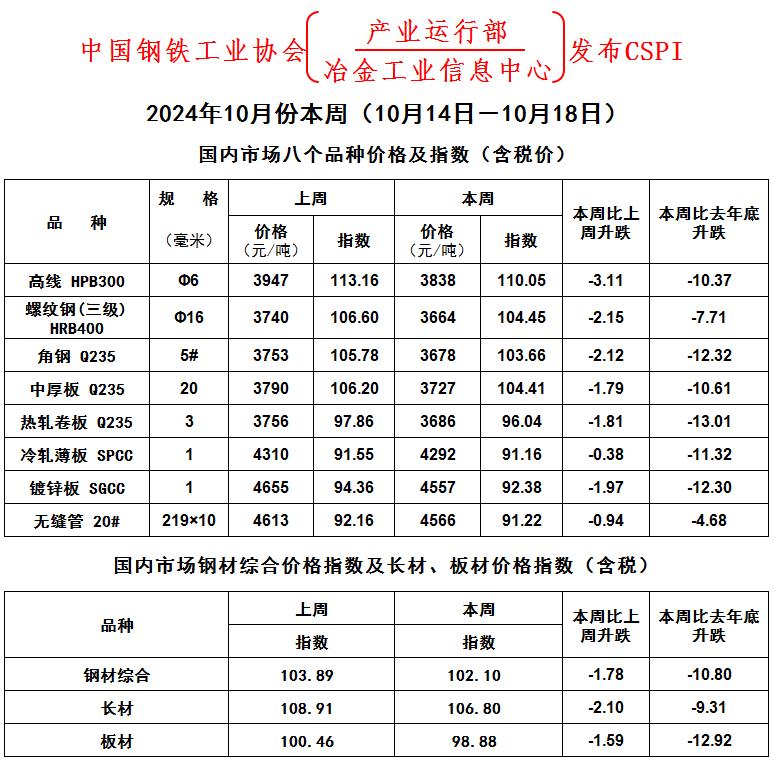 2024年10月份本周(10月14日-10月18日)國(guó)內(nèi)市場(chǎng)八個(gè)品種價(jià)格及指數(shù)
