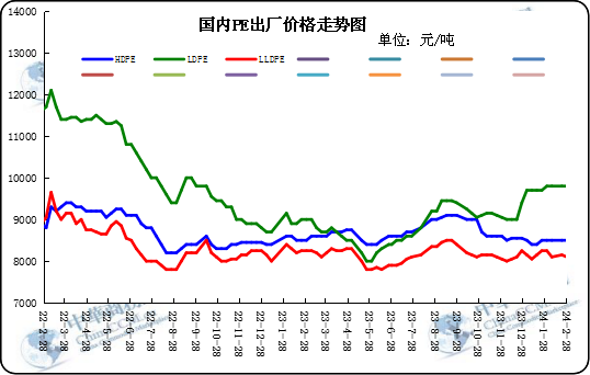2月PE市場價格漲跌互現,本月聚乙烯市場年前成交表現尚可,價格變動多跟隨期貨調整為主,年后下游開工復蘇緩慢,成交多較為謹慎,貿易商隨行就市為主。其中本月國際原油價格整體上漲;本月乙烯價格緩慢持續上漲。石腦油制PE和煤制PE的原料價格皆有不同程度上漲,成本端對國內聚乙烯期貨起到利好指引。臨近春節,終端退市前適量備貨,需求對聚乙烯市場支撐尚可。然開年各行業終端需求復蘇緩慢,下游優先消耗年前庫存為主,市場內新單成交多小單商談。本月市場庫存水平較高,廠家裝置生產轉化比亦在較高水平。本月長期檢修裝置并未復工,廠家多繼續按計劃檢修,總體來說,本月聚乙烯市場內供應壓力較上月稍有下降。供需兩淡之下,聚乙烯市場依舊受到原料面指引占比更大,整體來看,短期內聚乙烯市場價格在期貨帶動之下寬幅震蕩。