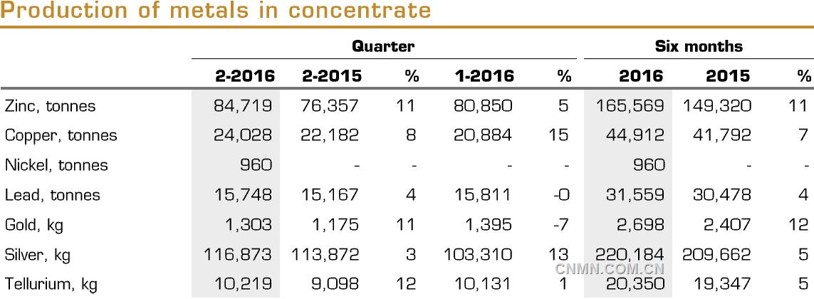 據玻利頓(New Boliden)公司2016年二季度報告披露:公司二季度鋅精礦產量84,719噸,同比增長11%,環比增長5%;鉛精礦產量15,748噸,同比增長4%,環比減少0.4%。2016年上半年,公司鋅精礦產量165,569噸,同比增長11%,鉛精礦產量31,559噸,同比增長4%;銅、鎳精礦產量24,028噸、960噸;金、銀產量2,698千克、220,184千克。