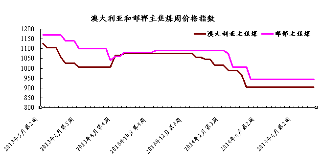 截至2014年7月第2周,澳大利亞主焦煤價格指數為905,與前一周相比持平;與此同時,中國邯鄲主焦煤價格指數為945,與前一周相比持平。